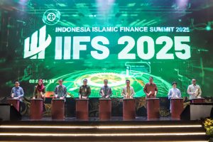 Ketua Dewan Komisioner Otoritas Jasa Keuangan (OJK) Mahendra Siregar (tengah) beserta jajaran anggota dewan komisioner OJK dan Sekretaris Daerah Jatim Adhy Karyono (keempat kiri) membuka Indonesia Islamic Finance Summit (IIFS) 2025 di Surabaya, Jawa Timur, Senin (3/11/2025). IIFS 2025 yang mengusung tema Mainstreaming Islamic Finance through Islamic Financial Deepening tersebut bertujuan untuk mendorong pengembangan dan penguatan sektor keuangan syariah, mempererat sinergi antar pemangku kepentingan, dan meningkatkan literasi serta inklusi keuangan syariah. NERACA/Antarafoto/Rizal Hanafi/nz