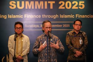 Ketua Dewan Komisioner Otoritas Jasa Keuangan (OJK) Mahendra Siregar (tengah), didampingi Wakil Ketua Dewan Komisioner OJK Mirza Adityaswara (kiri), dan Sekretaris Daerah Jatim Adhy Karyono (kanan) menyampaikan ketarangan pers saat acara Indonesia Islamic Finance Summit (IIFS) 2025 di Surabaya, Jawa Timur, Senin (3/11/2025). IIFS 2025 yang mengusung tema Mainstreaming Islamic Finance through Islamic Financial Deepening tersebut bertujuan untuk mendorong pengembangan dan penguatan sektor keuangan syariah, mempererat sinergi antar pemangku kepentingan, dan meningkatkan literasi serta inklusi keuangan syariah. ANTARA FOTO/Rizal Hanafi/nz