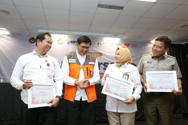 Dari kiri) Asisten Deputi Moderasi Beragama Kementerian Koordinator Pembangunan Manusia dan Kebudayaan Asep Sunandar, Chief Executive Officer Rumah Zakat Irvan Nugraha, Pimpinan Badan Pelaksana Badan Pengelola Keuangan Haji (BPKH) Sulistyowati dan Deputi Bidang Pencegahan Badan Nasional Penanggulangan Bencana (BNPB) Pangarso Suryotomo berbincang disela peluncuran gerakan “Kuat Bersama” di Jakarta, Senin (22/12/2025). Program “Kuat Bersama” merupakan inisiatif kolaboratif Rumah Zakat dalam merespons bencana banjir dan tanah longsor yang melanda sejumlah wilayah di Aceh, Sumatera Utara, dan Sumatera Barat sejak pertengahan November 2025 akibat cuaca ekstrem dan curah hujan tinggi. Selama masa tanggap darurat, Program Peduli Bencana Sumatera #KuatBersama telah menjangkau 75.045 penerima manfaat melalui penyaluran bantuan pangan, dapur umum, air bersih dan sanitasi, layanan kesehatan dan psikososial, evakuasi dan SAR, hingga logistik pengungsian.