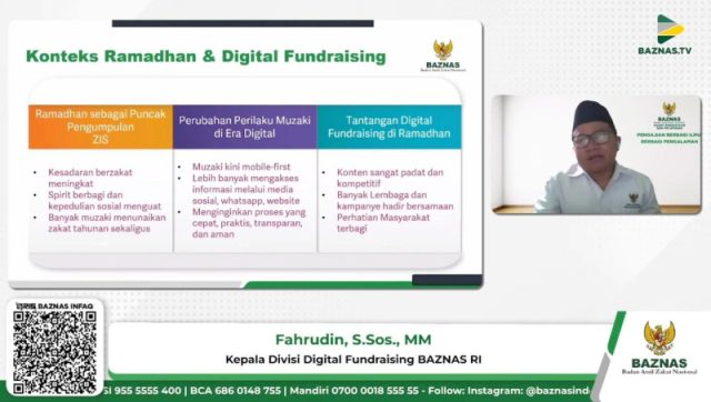 Hal tersebut mengemuka dalam Pengajian BAZNAS Selasa Pagi bertema “ Desain Konten Dan Digital Fundraising Ramadhan Melalui Kantor Digital”, yang diselenggarakan Pusdiklat BAZNAS RI dan disiarkan melalui kanal YouTube BAZNAS TV, pada Selasa (13/1/2025). Hadir Pimpinan BAZNAS RI Bidang Transformasi Digital Nasional, Prof. Ir. Nadratuzzaman Hosen, MS., M.Ec, Ph.D., Kepala Humas BAZNAS RI Yudhiarma MK,M.Si., Kepala Divisi Pengumpulan Digital BAZNAS RI, Fahrudin, S.Sos., M.M., serta Pimpinan dan amil BAZNAS Provinsi/Kabupaten/Kota seluruh Indonesia yang hadir secara daring.