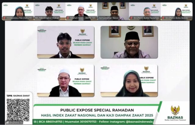 Hal tersebut mengemuka pada Public Expose Hasil Perhitungan Indeks Zakat Nasional dan Kaji Dampak Zakat 2026,secara daring, Selasa (3/3/2026), yang dihadiri Pimpinan BAZNAS RI Bidang Perencanaan, Kajian, dan Pengembangan, Dr. Zainulbahar Noor, SE, M.Ec., serta Direktur Kajian dan Pengembangan BAZNAS RI, Dr. Muhammad Hasbi Zaenal.