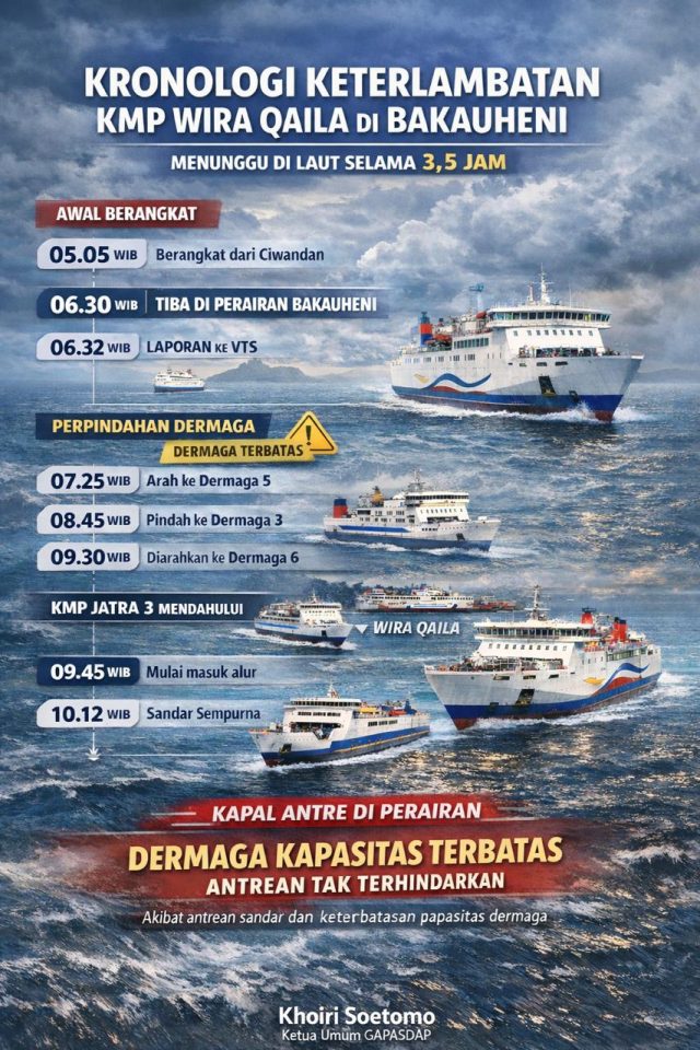 Jakarta, Gabungan Pengusaha Nasional Angkutan Sungai, Danau, dan Penyeberangan (GAPASDAP) angkat bicara terkait keterlambatan sandar KMP Wira Qaila di Pelabuhan Bakauheni yang sempat viral di media sosial.