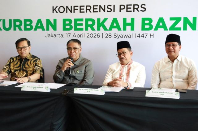 Hal ini disampaikan Ketua BAZNAS RI, Dr. Ir. H. Sodik Mudjahid, M.Sc. dalam konferensi pers peluncuran Kurban Berkah Berdayakan Desa 2026 di Jakarta, Jumat (17/4/2026). Turut hadir Wakil Ketua BAZNAS RI Dr. H. Zainut Tauhid Sa’adi, M.Si., Pimpinan BAZNAS RI Bidang Mobilisasi dan Pengumpulan Dr. H. Rizaludin Kurniawan, M.Si., Deputi II BAZNAS RI Bidang Pendistribusian dan Pendayagunaan Dr. KH. M. Imdadun Rahmat, M.Si., beserta jajarannya.